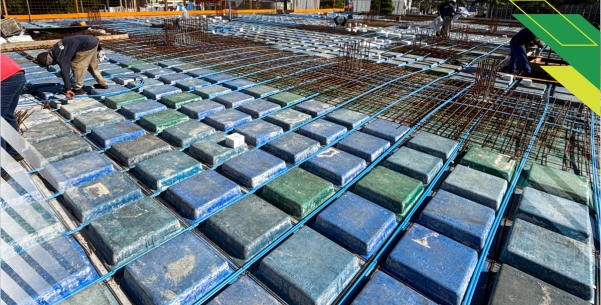 A adoção do Pavplus gerou ganhos expressivos em economia de materiais: redução significativa no volume de concreto em comparação às lajes maciças protendidas tradicionais, além da diminuição no consumo de aço passivo e ativo, graças à leveza da solução estrutural.